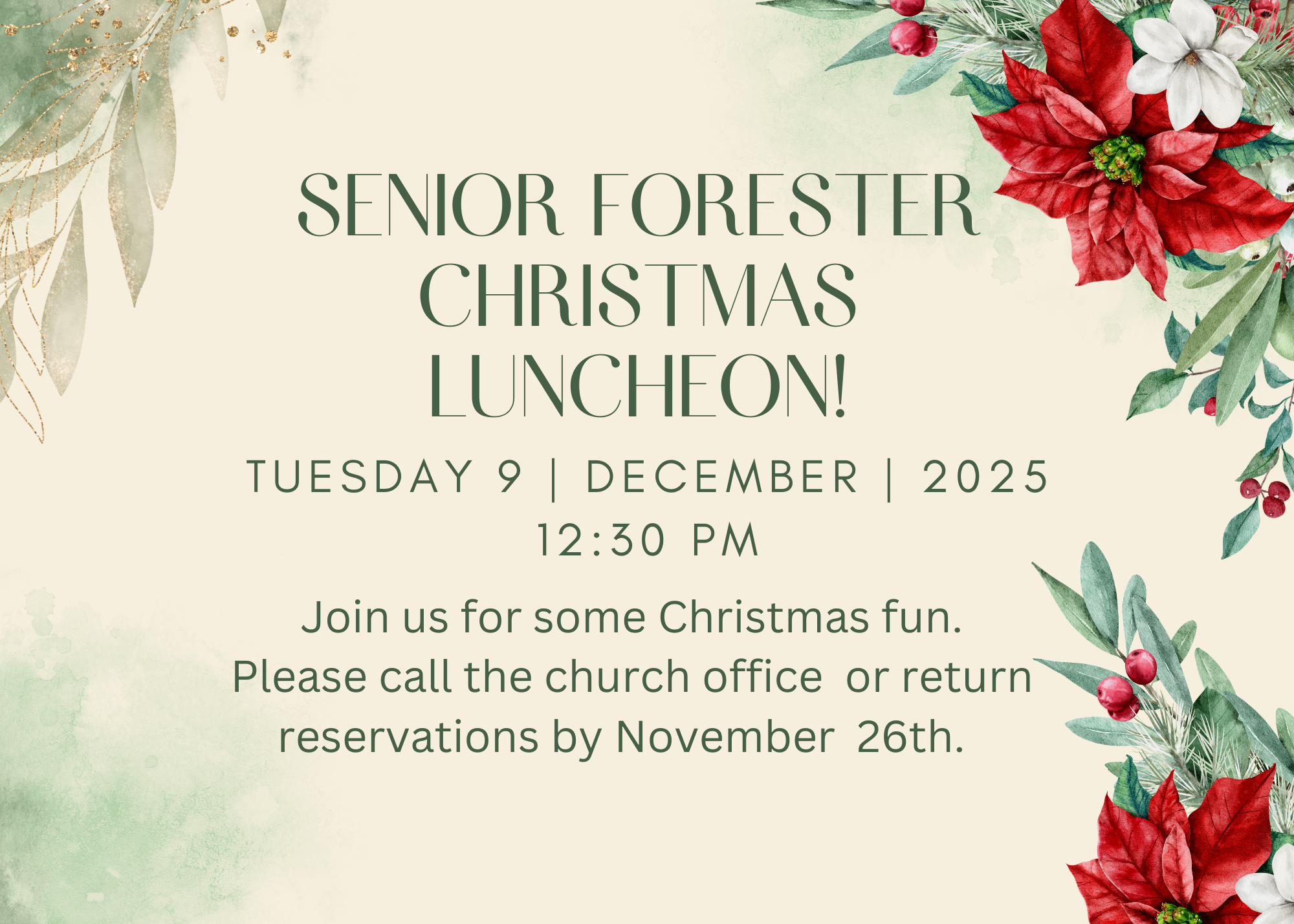 Join us for our annual Christmas Meal, December 9 at 12:30 in the Fellowship Hall. Our meal will be catered so we will need a headcount. Please call the church office by November 26th if you plan to join us for this festive meal and time together.