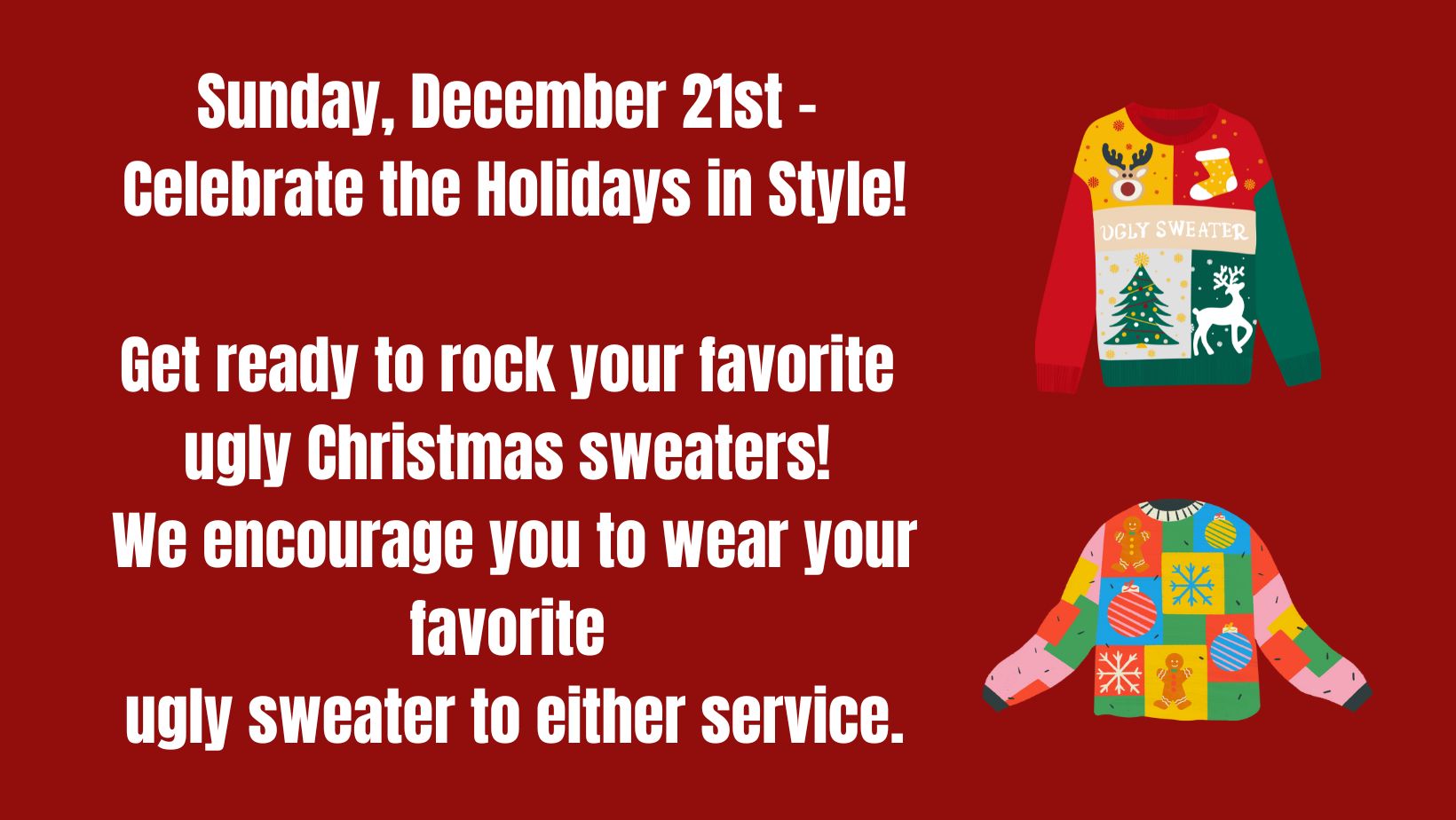 Dig your favorite ugly sweater out of your closet and wear them to church on December 21st to either service.
